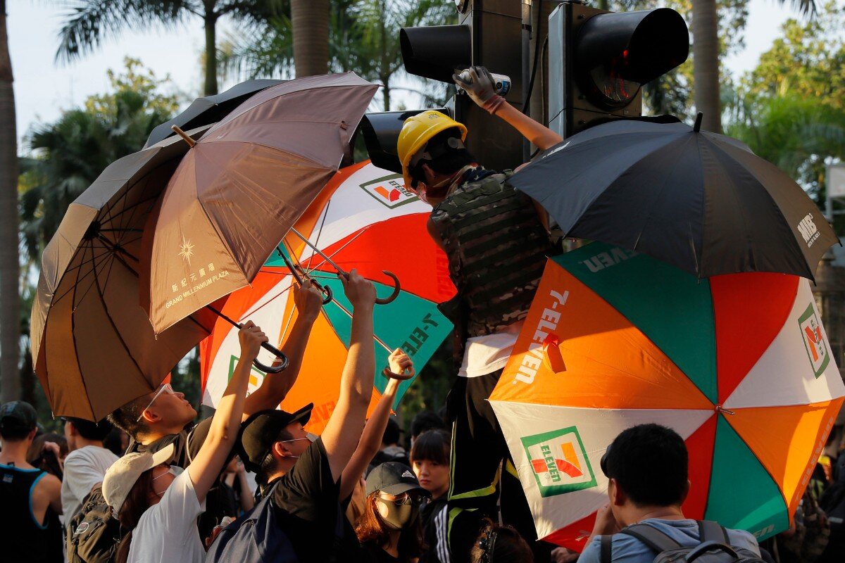 The potential repercussions have compelled protesters to maintain anonymity whenever possible. Umbrellas serve not only as tear gas shields, but also as cloaks. A shout of "It's raining!" will prompt protesters to form a canopy of umbrellas to conceal what's going on underneath them 鈥 the building of barricades using metal road barriers, construction fences and other public materials tied together with string.
