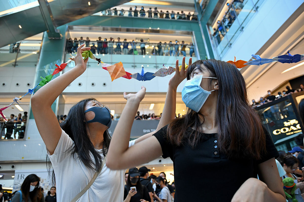 Wearing a black T-shirt, black pants, and a surgical mask to hide her face, Valerie folds a delicate pink origami crane, crafting the bird that represents happiness together with thousands of other pro-democracy protesters packing a Hong Kong mall on Sunday.