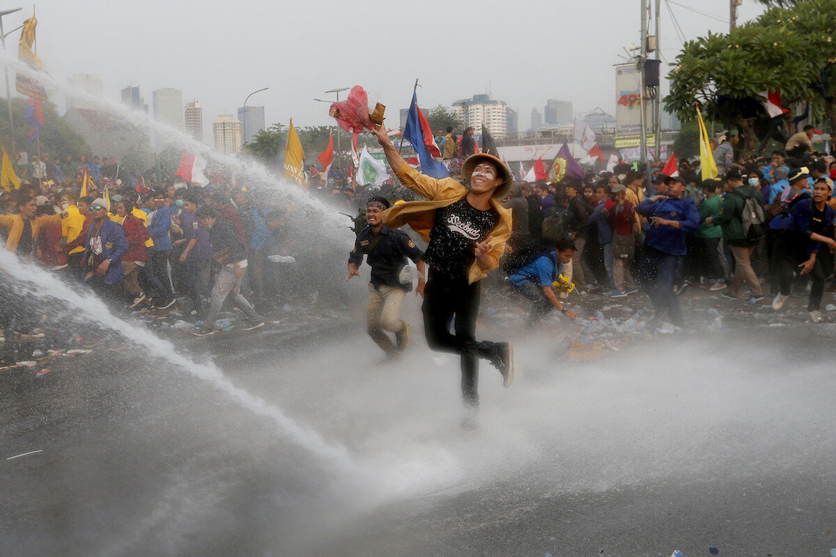 In a demonstration in Makassar, the main city on Sulawesi island, thousands of protesters blocked streets, set fires, and pelted police with rocks. Riot police responded by firing water cannons and tear gas.