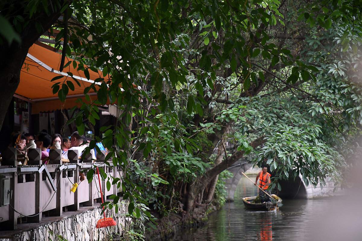 Following his example, I steep my tea, and wait. Birdsong draws my gaze upward to the forest-like canopy. A golden carp jumps in the water below my teahouse perch, creating ripples on the lake. I take a sip, and time slows down.