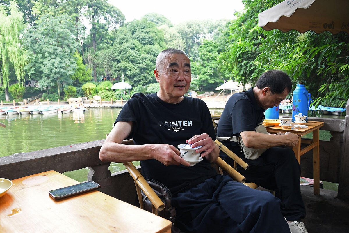 Not long afterward, a retired Chengdu worker with a buzz cut and plaid shirt arrives at a nearby table. He rinses his cup, tossing the water into the lake with a splash. After steeping his tea, he uses the lid to stir and cool it. 鈥淚 come here whenever I have time,鈥 he says, holding the lid to strain the leaves and sipping tea off the rim.
