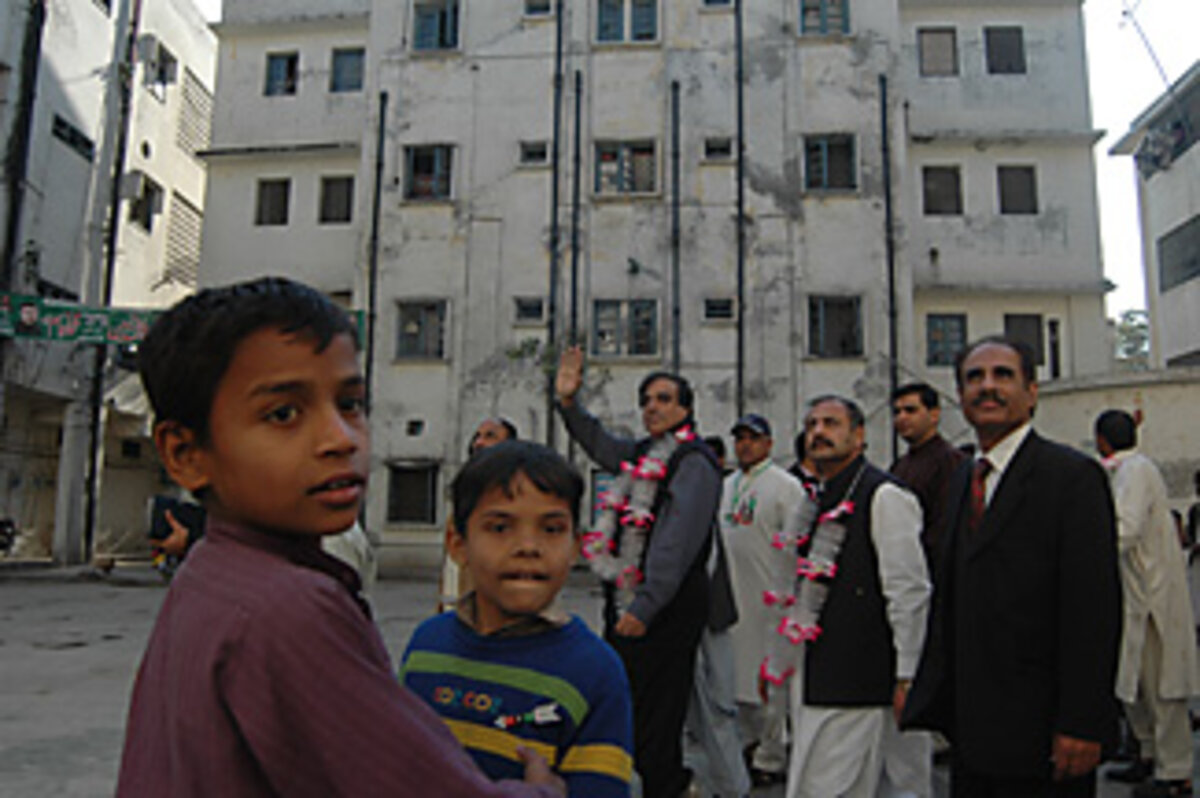 Along the route of Bader's rally through Lahore, Mumtaz Ali Khan stands outside his necktie shop in Anar Kali market, awaiting Bader's arrival with a PPP pin and a broad smile.