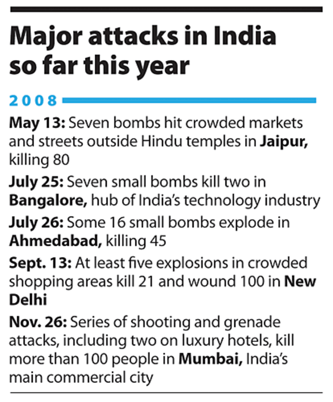 Indeed, the threats to India are so varied and mutating that it was not clear who was responsible for the attacks even two days after they began. The largest bombings of recent months have been carried out predominantly by Indian Muslims who called themselves the Indian Mujahideen.