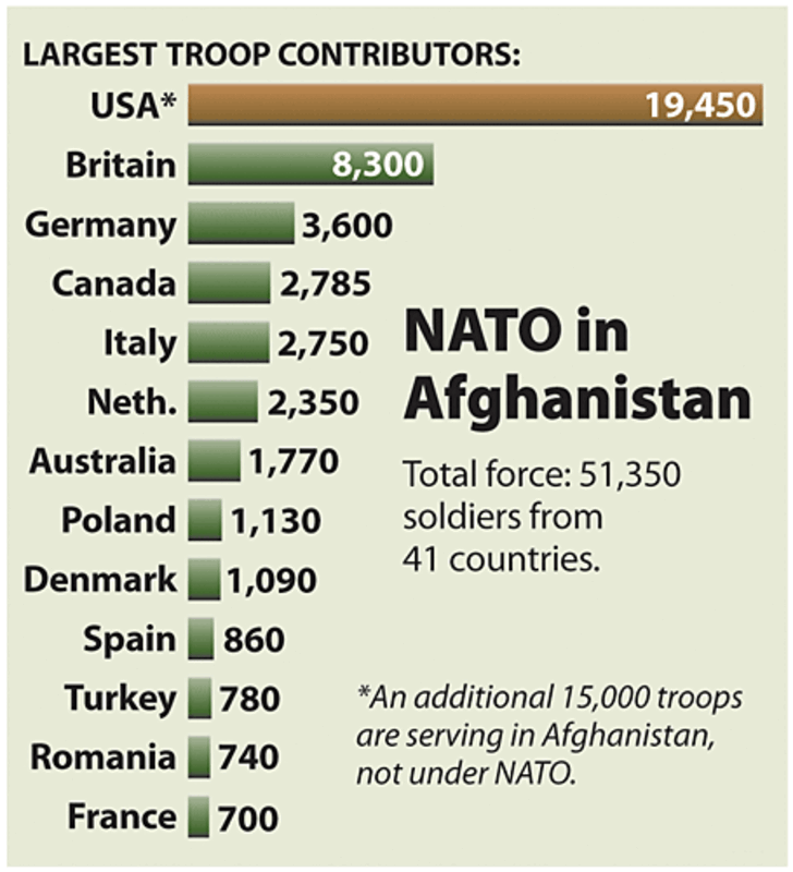 The 41 NATO countries involved in Afghanistan 鈥 who make up roughly 55,000 of the 70,000 troops in the country 鈥 have differing rules of operation. Some refuse to deploy to combat-intensive zones and others have already set withdrawal dates. "The international forces can't fight the Taliban if they don't have a unified command and outlook," says Rafeh.
