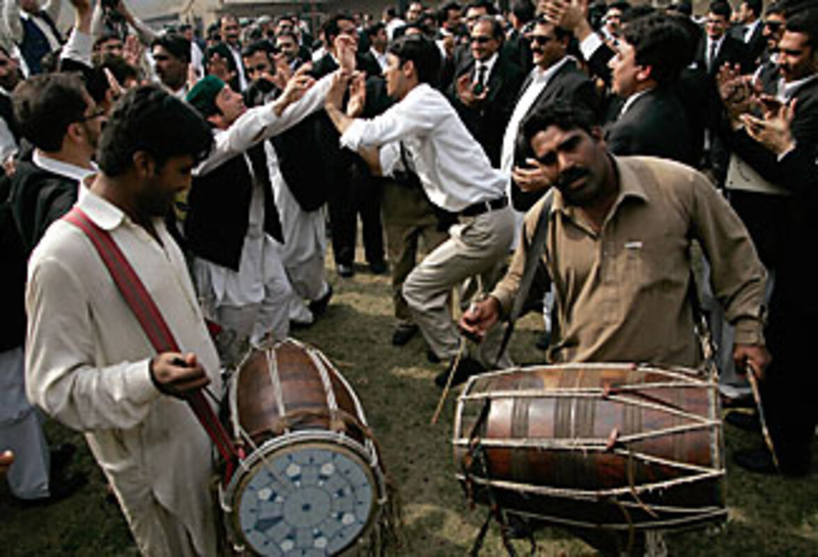They came with flags, candies, and chants of "Rule of law!" Thousands of jubilant Pakistanis made a pilgrimage to the residence of former Chief Justice Iftikhar Chaudhry early Monday, saying that Pakistan had proved itself worthy of the name of democracy.