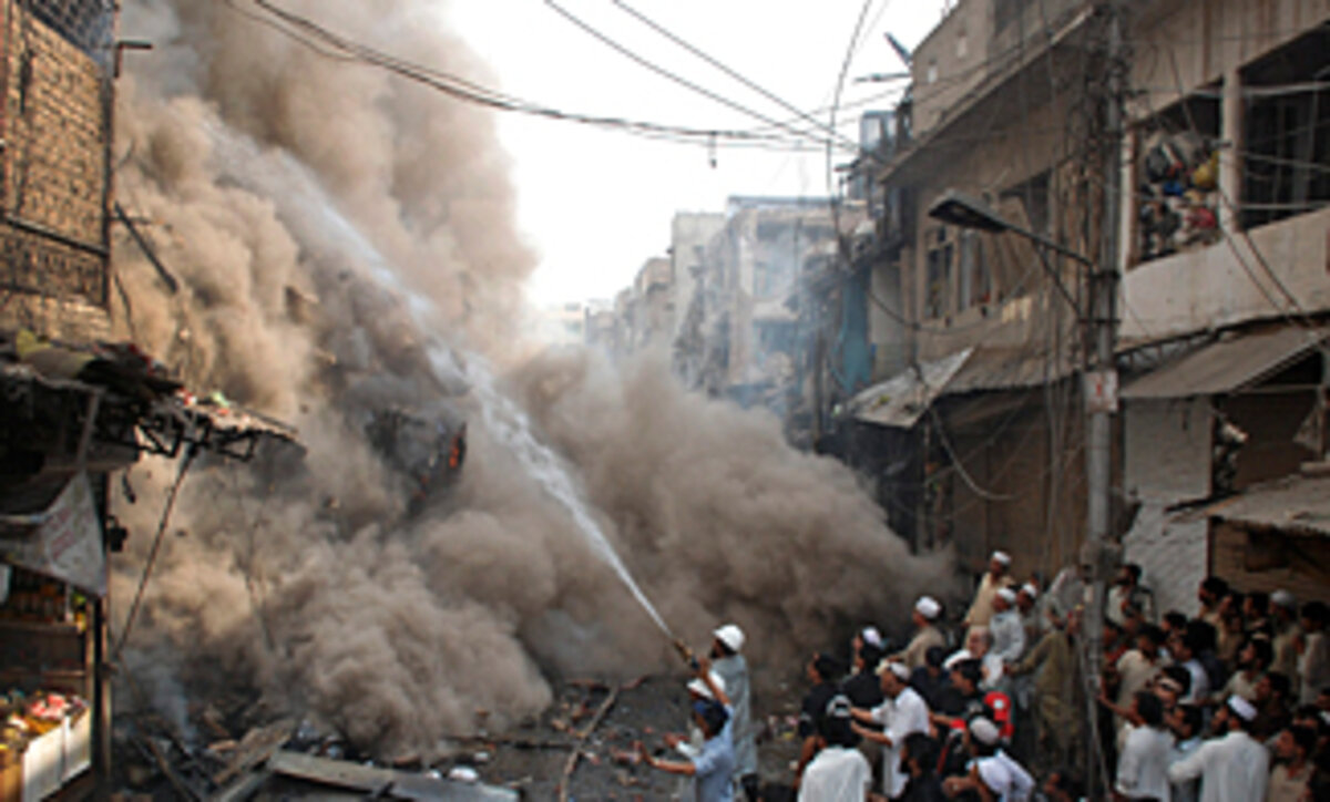 Television footage from Wednesday's blast showed that many shops and vehicles in the area had caught fire while people frantically sought survivors amid the rubble of the Peepal Mandi marketplace. The market sells mostly women's products.