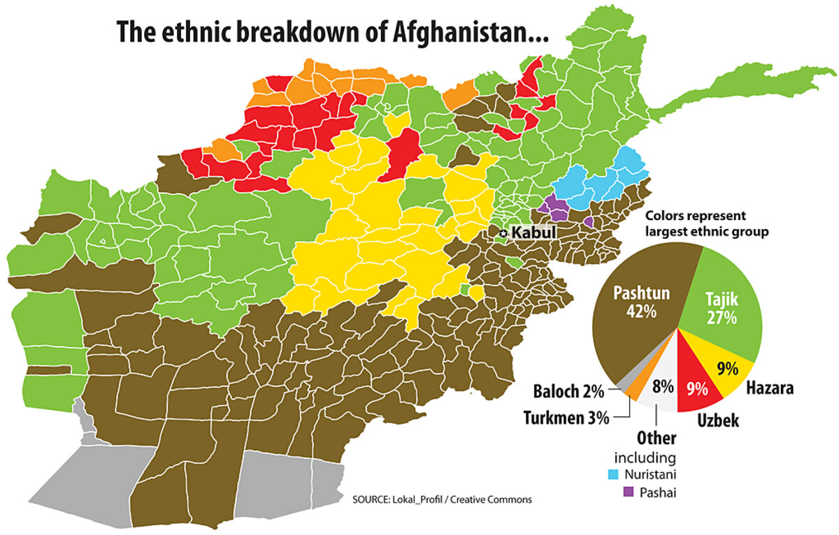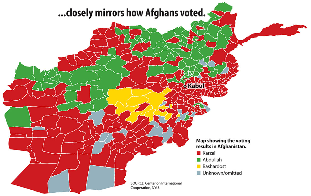 Voting patterns in Afghanistan show strong overlap with ethnic identity. (See map.) Afghanistan was torn apart in the 1990s during a civil war among ethnic-based warlords, and the outcome of the controversial election in August threatens to rekindle ethnic tensions and burnish the power of the old warlords.