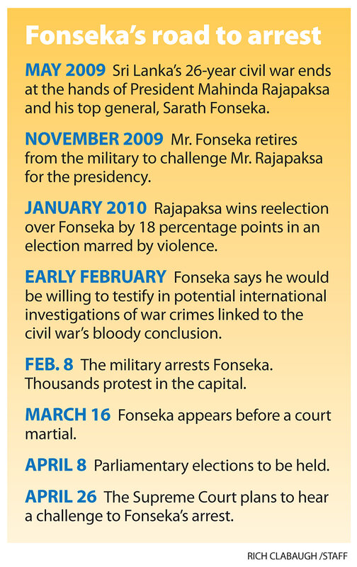 Fonseka denies the charges against him. His supporters are pinning some hope that the Supreme Court, which plans in late April to hear challenges to his detention, could nullify the court-martial. Sri Lanka's former chief justice and a prominent Fonseka backer, Sarath Silva, has argued that because the general left the military in November he can now only be tried in a civilian court.