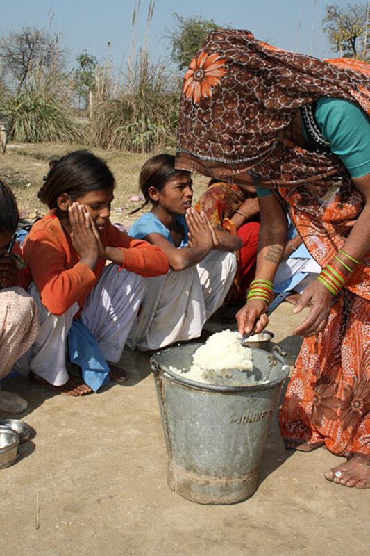 Shamvir and his classmates squat in the dirt, watching as the sari-draped lunch ladies go down lines filling the metal bowls in front of them.