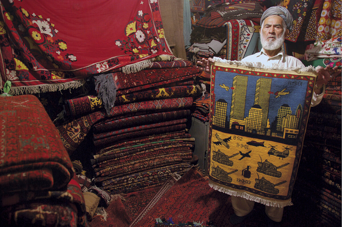 Though Mr. Qul sells predominately traditional Persian carpets, like most Chicken Street venders he offers a small selection of Sept. 11-themed rugs. These commemorative carpets are about the size of a doormat and feature crude, hand-woven images of planes striking the World Trade Center.