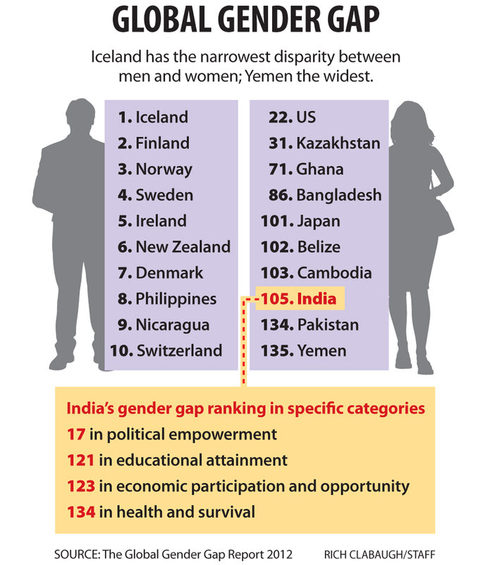 The World Economic Forum ranked India 105 on the Gender Gap Index in 2012, up from the year before, but below its 2006 ranking, and far below countries like Ghana and Bangladesh. It scored highest on political empowerment and lowest in women's health and survival.