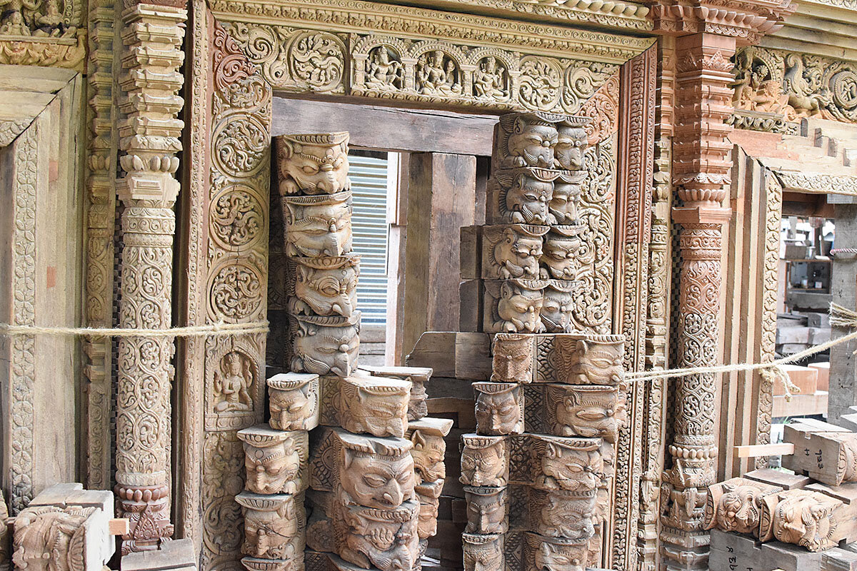 In a workshop inside the courtyard of a 17th century palace, Tirtha Ram Shilpakar is surrounded by the guts of ancient temples. The floor around him is crowded with carved wooden beams, ashy with age. The walls are lined with pillars and detached windows. A few steps off lies an 11-ft.-wide doorway, dissected on the floor.