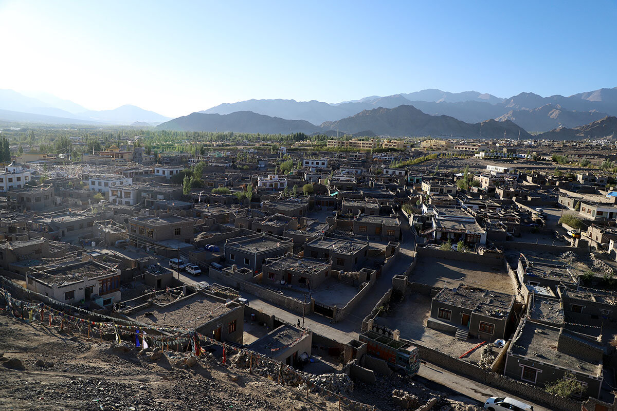 Choglamsar is a cluster of one-story mud brick houses, with a monastery atop its foothill. From the monastery, one can see the whole town on the banks of the Indus River– 11,000 feet up, surrounded by mountains. On one end of the hill, painted stones spell out “Save Tibet” near a community center, where residents queue to get tested for COVID-19. A Tibetan flag is waving on the top of the center.