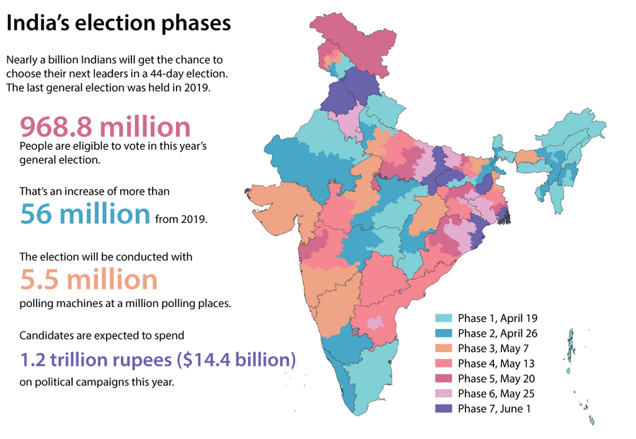 Nearly a billion people are eligible to vote in India鈥檚 general election, which begins Friday and lasts for more than a month. It will be the largest democratic election in human history.