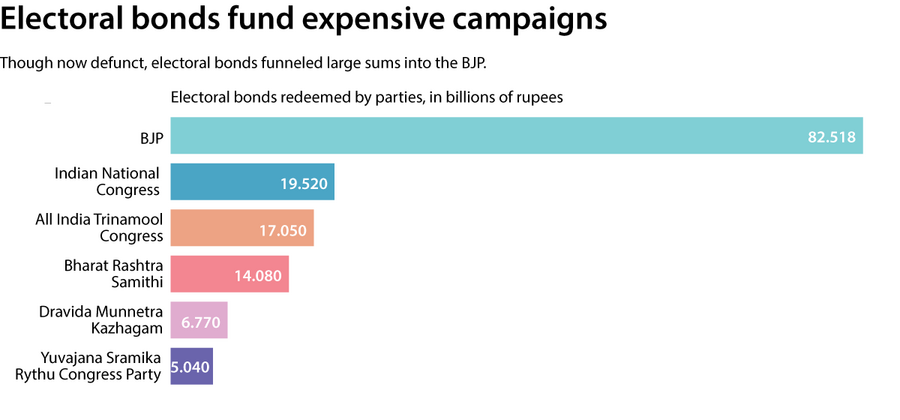 According to experts, these elections are also poised to become the most expensive globally, with money spent by political parties and candidates expected to exceed the $14.4 billion spent on the U.S. presidential and congressional races in 2020. Already $2 billion has been funneled through India鈥檚 electoral bonds system, a now-defunct program introduced by the BJP government in 2017, enabling anonymous donors 鈥 including corporations 鈥 to fund political parties.