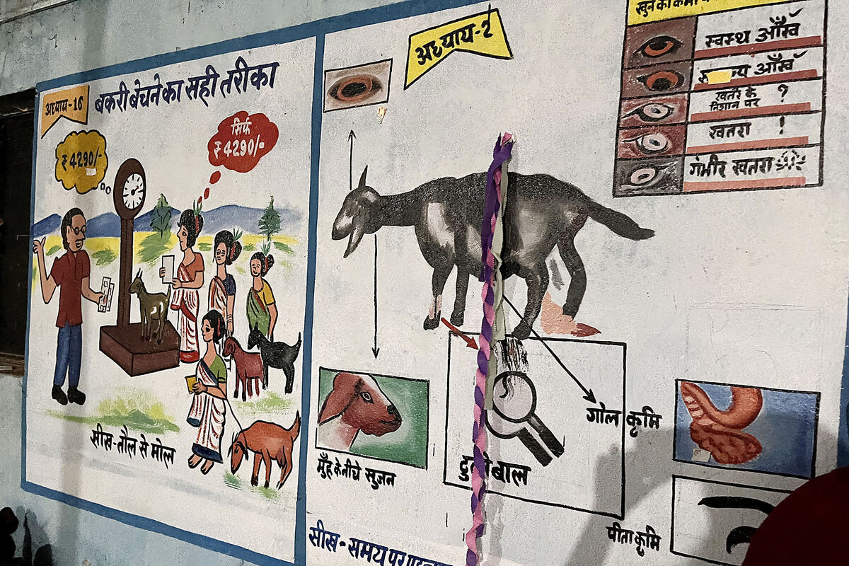 At the community hall near Ritmani Devi’s home in Getalsud village, the walls are painted with training material, including illustrations of common symptoms to look out for, like swelling under the animal’s mouth or pale eyes, and tips on how to negotiate better rates for goats in the market.