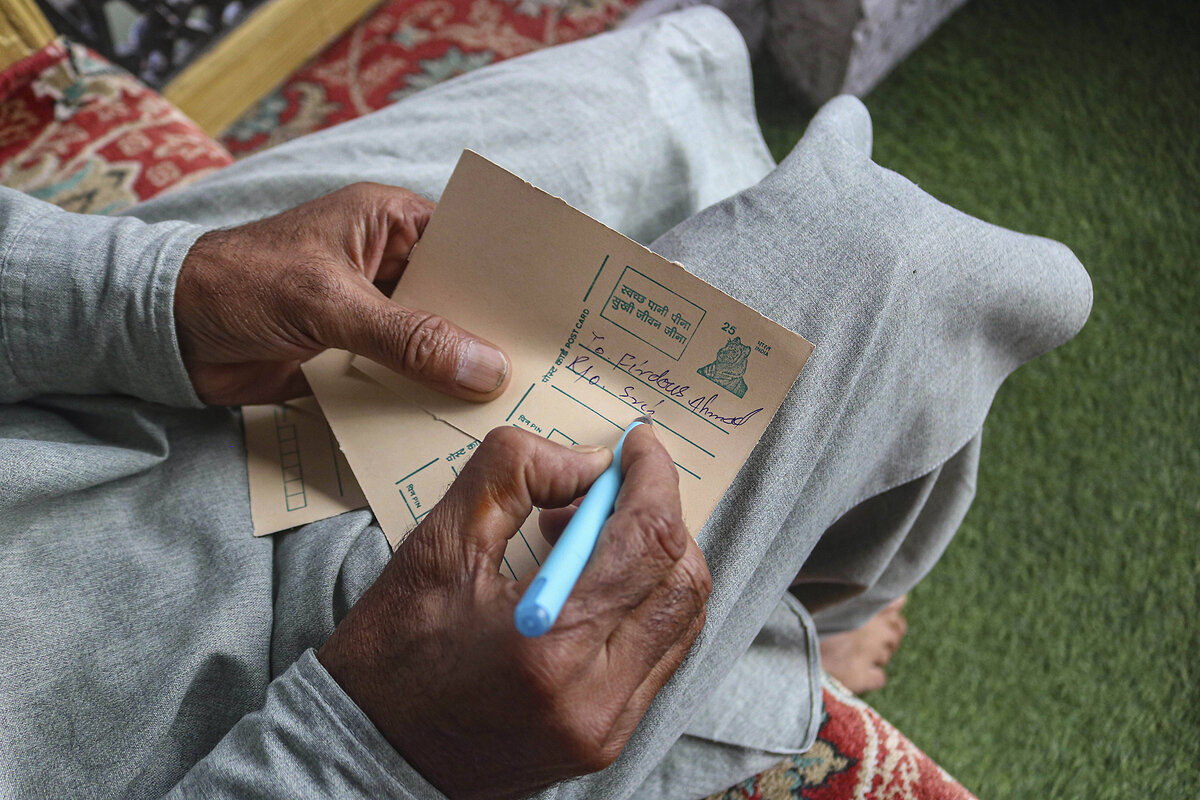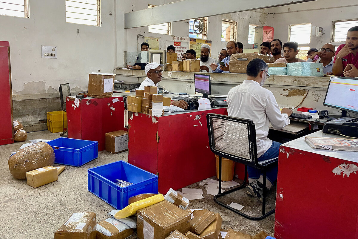Bhushan Singh Chauhan, a post office manager, shuffles through official documents at his desk in a dimly-lit, high-ceilinged post office in southern New Delhi. Around him, his team processes packages from customers waiting in multiple queues. Over the years, Mr. Chauhan has witnessed a sharp decline in domestic letters and registered posts, but international parcels have steadily increased.