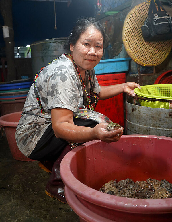 鈥淚 just want more business and the border reopened,鈥 says Nok Supalaitri, who runs a frogs and fish stand in Sisaket town鈥檚 night market. She splashes her tub of live frogs with fresh water from a hose as she prepares to close up shop for the evening.