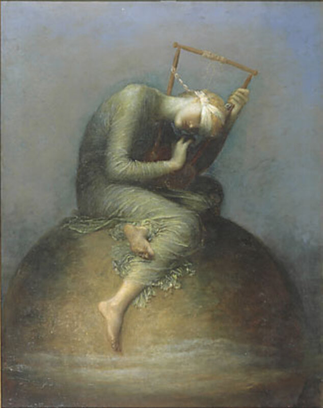 In drab browns and grays on a blue background, it depicts a young blindfolded woman strumming on the last unbroken string of a harp, her ear to the instrument.