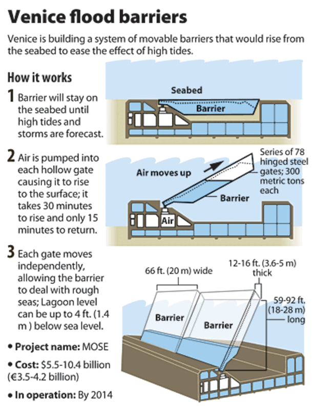 It also rekindled controversy over a multimillion-dollar scheme to save Venice's art and architecture. Known as Project Moses, it entails the construction of 78 giant steel gates across the three inlets through which water from the Adriatic flows into Venice's lagoon.