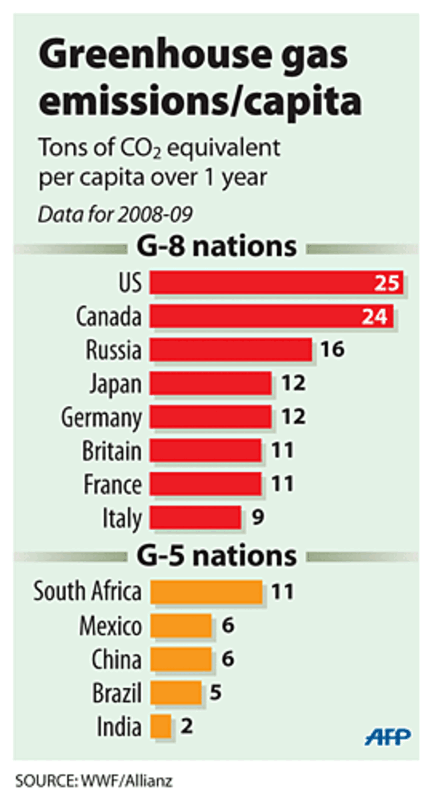Poorer nations also complain they're being asked to adopt expensive solutions that will slow economic growth, while economic powers like Japan and the US have already enjoyed the fruits of pumping lots of carbon dioxide (CO2), the principal greenhouse gas. A joint study by the World Wildlife Fund and the climate research unit of German insurer Allianz found that the US pumps the equivalent of 25 tons of CO2 per person a year. China, by contrast, pumps five.