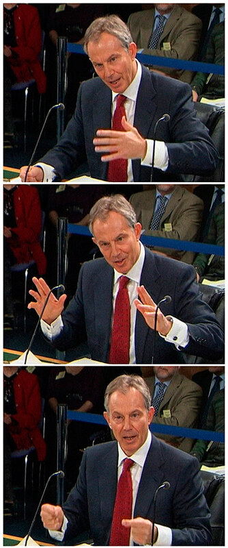 Leaning forward in his chair and adopting a somber expression, he appeared eager to press home points while members of the inquiry panel pressed him to answer key questions such as what he discussed with President George W. Bush during an April 2002 meeting in Crawford, Texas.