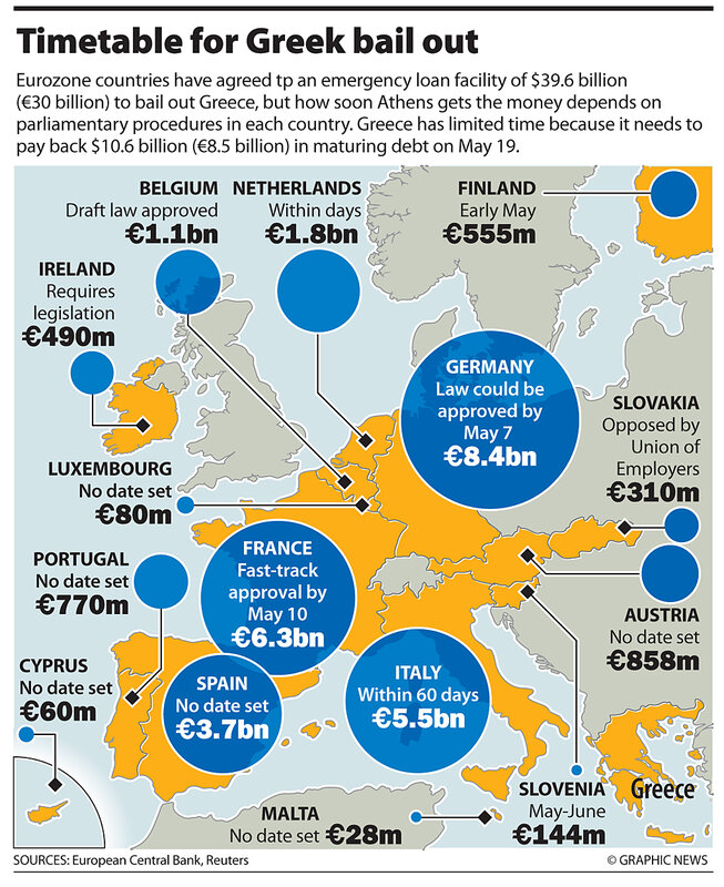 Earlier this week, European leaders and the IMF were mooting a 鈧45 billion ($60 billion) bailout. On Monday, economists Piero Ghezzi and Chrstian Keller at Barclays Capital argued in a research note that 鈧45 billion would tide Greece over for only about a year, and that Greece needs at least 鈧90 billion, coupled with tough austerity measures at home.