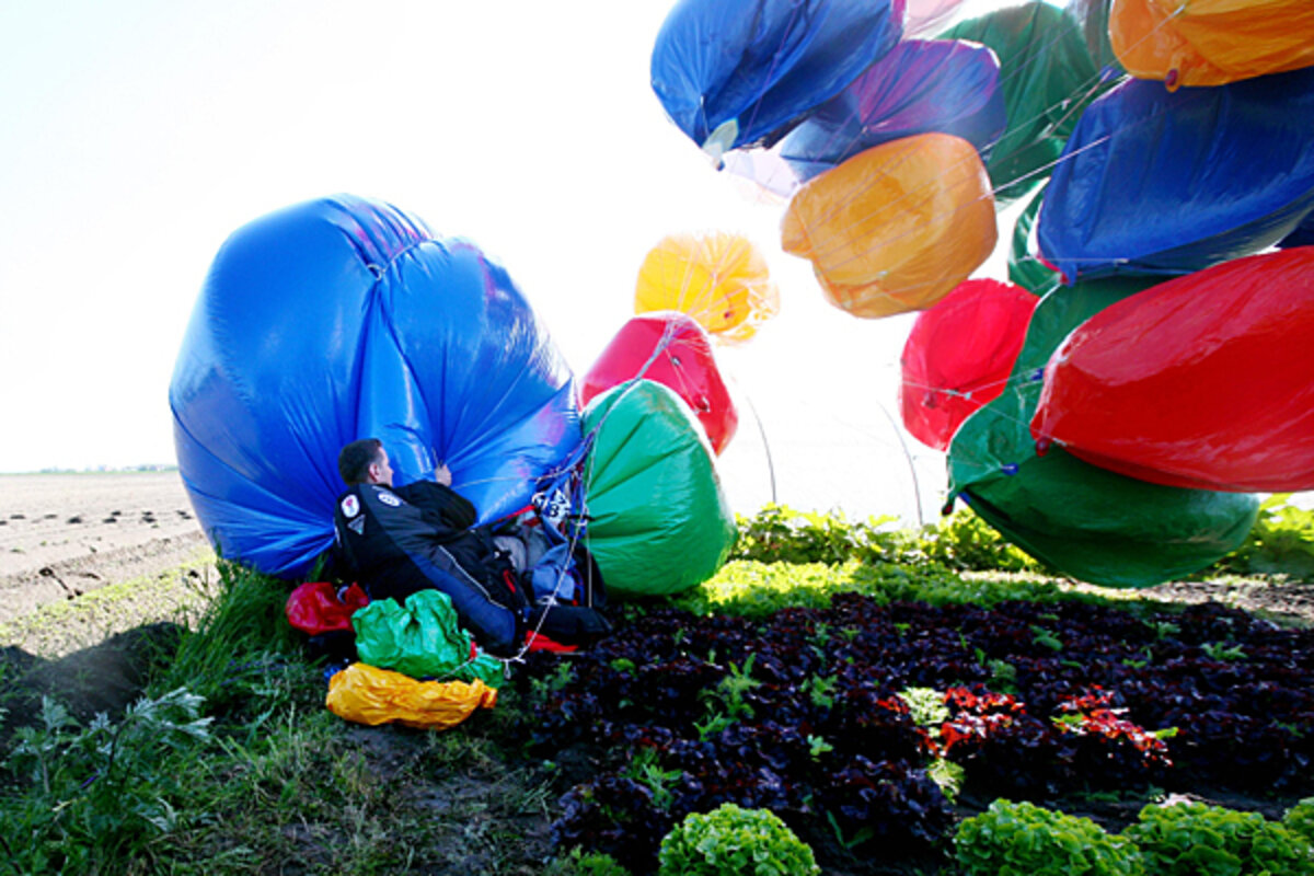 Trappe lifted off from Kent Gliding Club in Challock, near Ashford, England, with more than 54 helium-filled balloons attached to his chair at 5 a.m. Thursday. The night before, a team of helpers spent most of the .