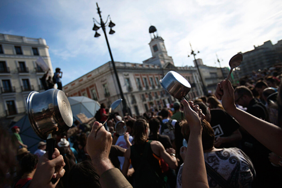 In Madrid鈥檚 emblematic Puerta del Sol, protesters yelled, 鈥淧eople, wake up, the siesta is over.鈥 Last night, thousands gathered to bang pots.