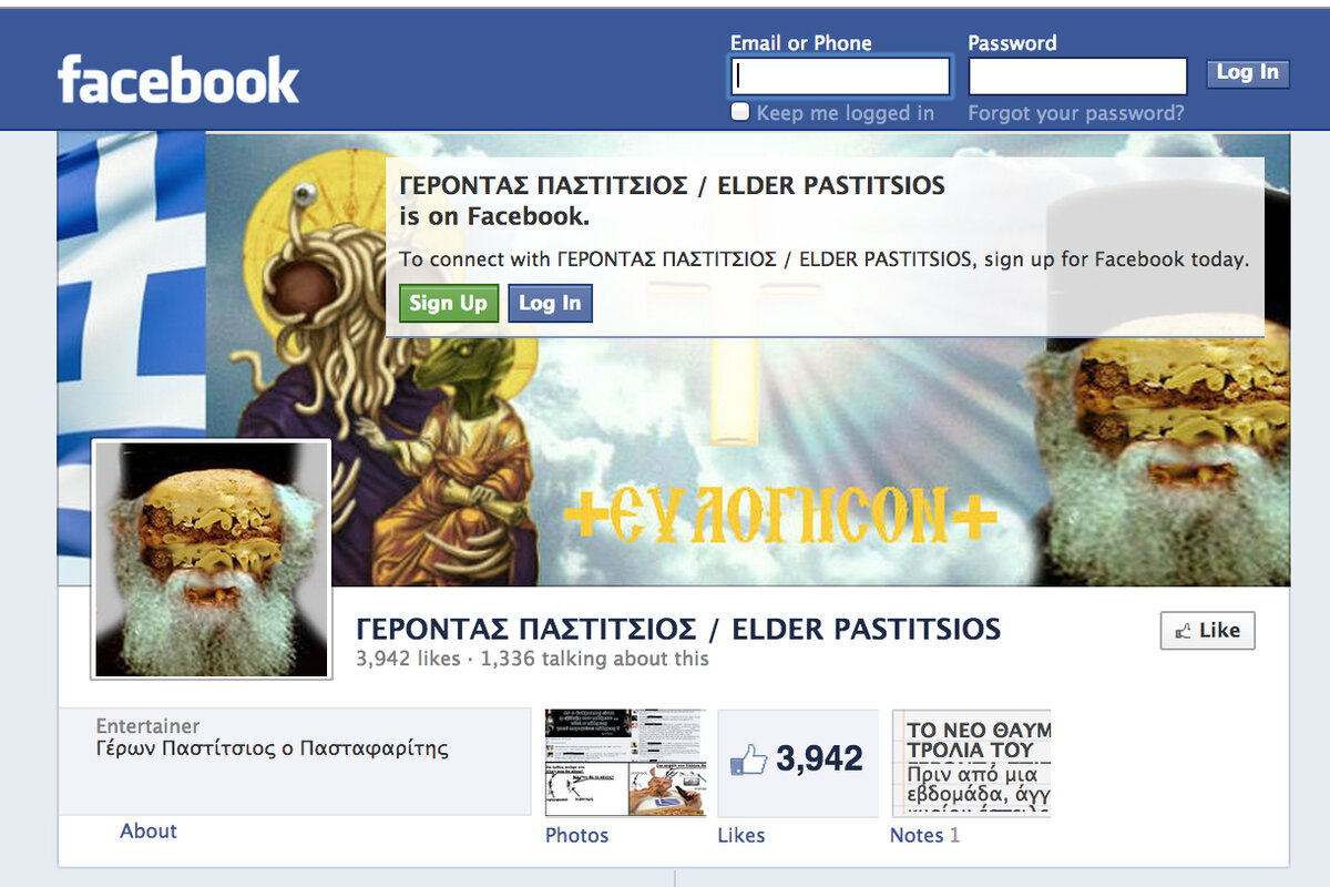 The accused, whose identity has not been made public, had created and managed the Facebook page , a name that plays on a combination of Elder Paisios, a famous, late Greek-Orthodox monk, and the Greek food pastitsio, a baked pasta dish made of ground beef and b茅chamel sauce. The term "pastafarian" is a reference to the satirical pseudo-religion "Church of the Flying Spaghetti Monster," which has been used to lampoon creationism. The picture of Elder Pastitsios has a pastitsio where the monk鈥檚 face should be.