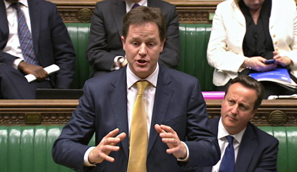 The body language was striking as he spoke. Sitting beside him, the prime minister remained stiff-jawed while across the floor of the House of Commons, Clegg鈥檚 nominal opponent, Labour leader Ed Miliband, nodded his head vigorously in agreement with the Liberal Democrat leader鈥檚 view that Britain鈥檚 first press law since 1695.