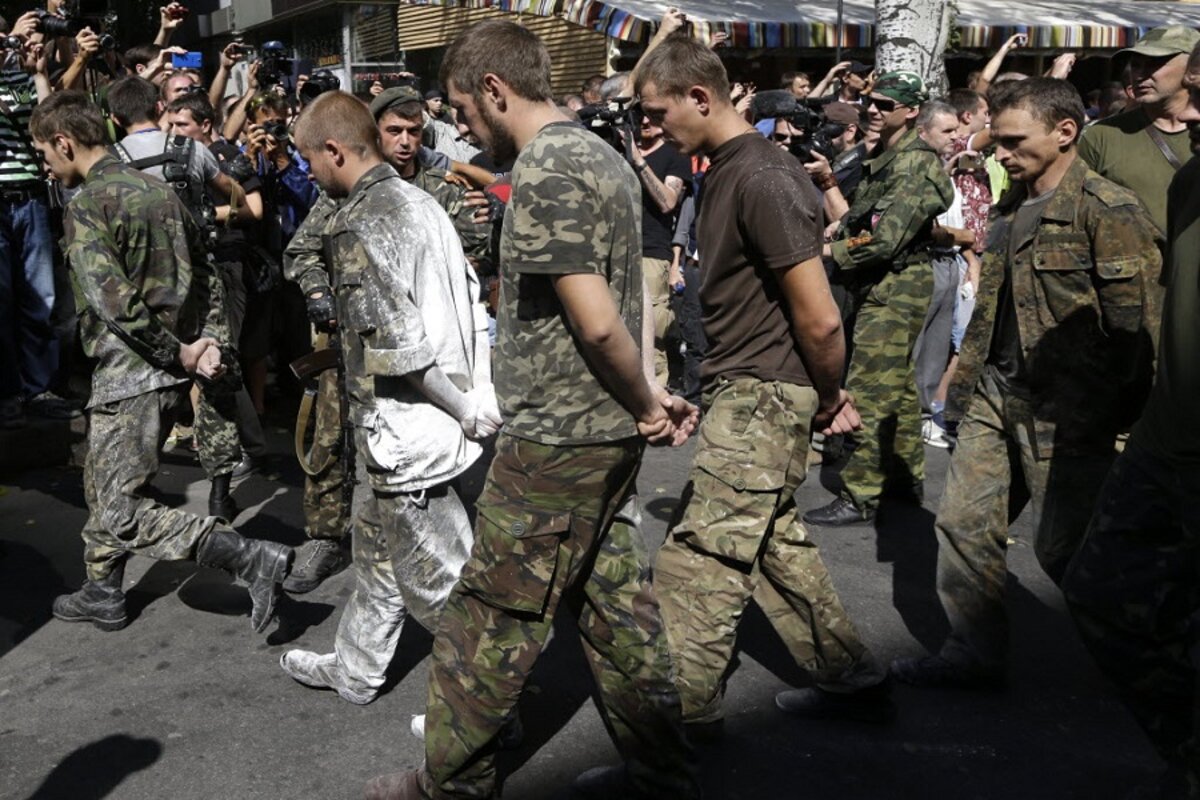 The dozens of captive Ukrainian soldiers moved down the main drag of this eastern rebel stronghold with their hands tied behind their back and their heads sunk low. Parallel rows of armed men ordered them to parade past the jeering crowds lining each side of the wide street.