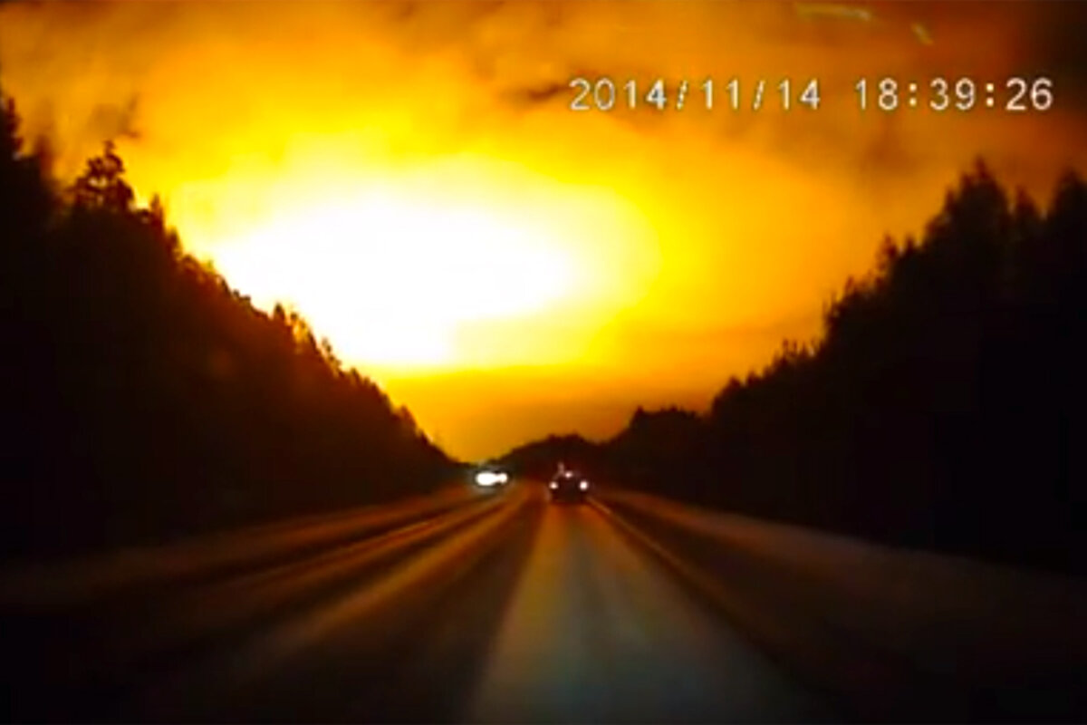 But super-hot meteorites plowing through the atmosphere typically explode with a blinding white flash, say experts. That's exactly what happened in February 2013, when a 10,000-ton space rock blew up amid a series of sonic booms and blinding explosions in the sky over the Urals city of Chelyabinsk.