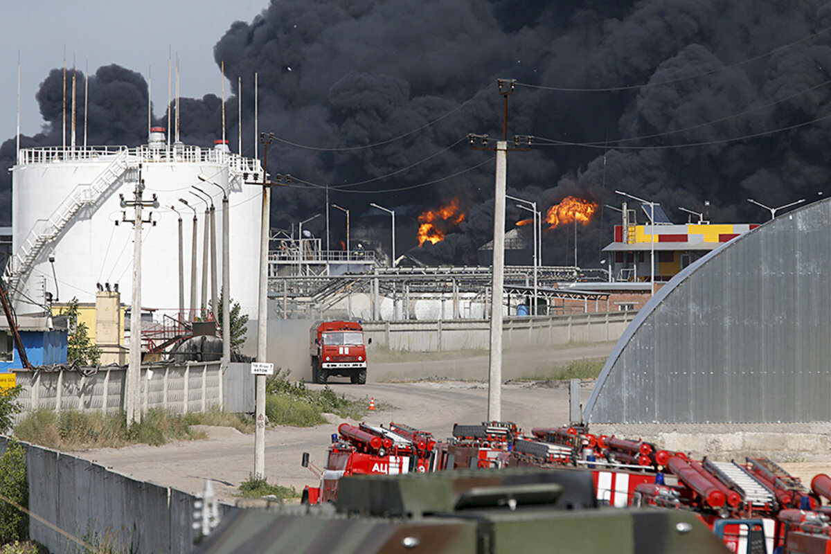 Entire oil tanks were consumed in the flames, which emergency services had feared would spread to another fuel depot nearby. Weapons and equipment were removed from a neighboring military base to a place of safety.