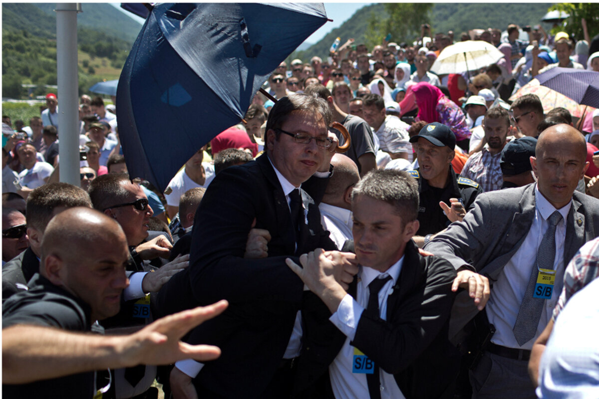 Serbia鈥檚 Prime Minister Aleksandar Vucic had a brutal reminder of that Saturday. As he walked into a ceremony, a memorial honoring 8,000 Bosnian Muslims killed by 海角大神 Serbs in Srebrenica, he was met by a crowd seething with anger and leading boisterous chants.