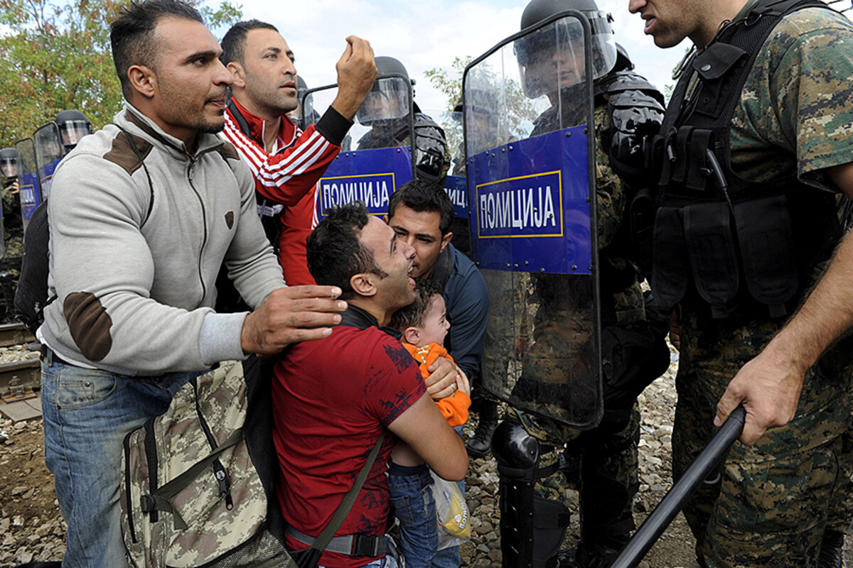 Hours after the clashes, Macedonian police started letting small groups of families with children cross the border by walking along the railway tracks to the railway station in the Macedonian town of Gevgelija.