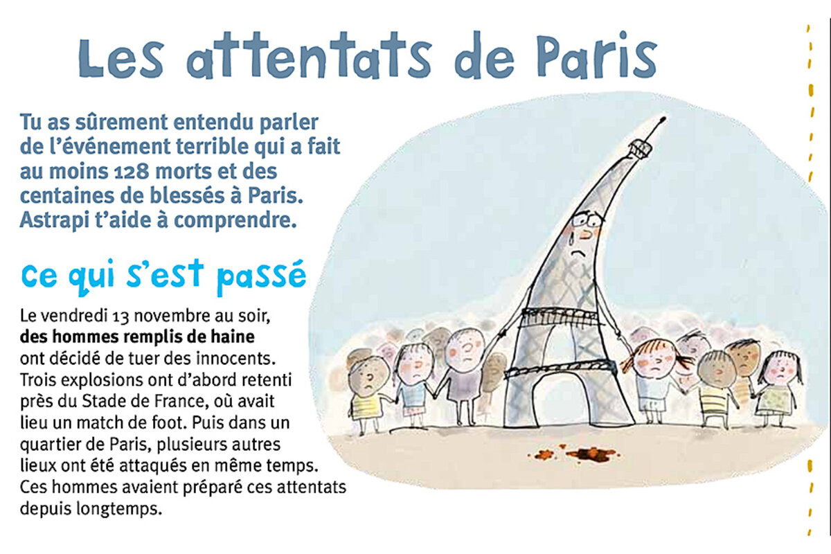 Astrapi, a French children鈥檚 magazine, published a in the 24 hours following the events on how to explain the attacks. The magazine鈥檚 illustrator, Frederic Benaglia, says the idea to create a cartoon about the attacks came to him naturally the next morning, after watching the events unfold on TV with his 15-year-old son.