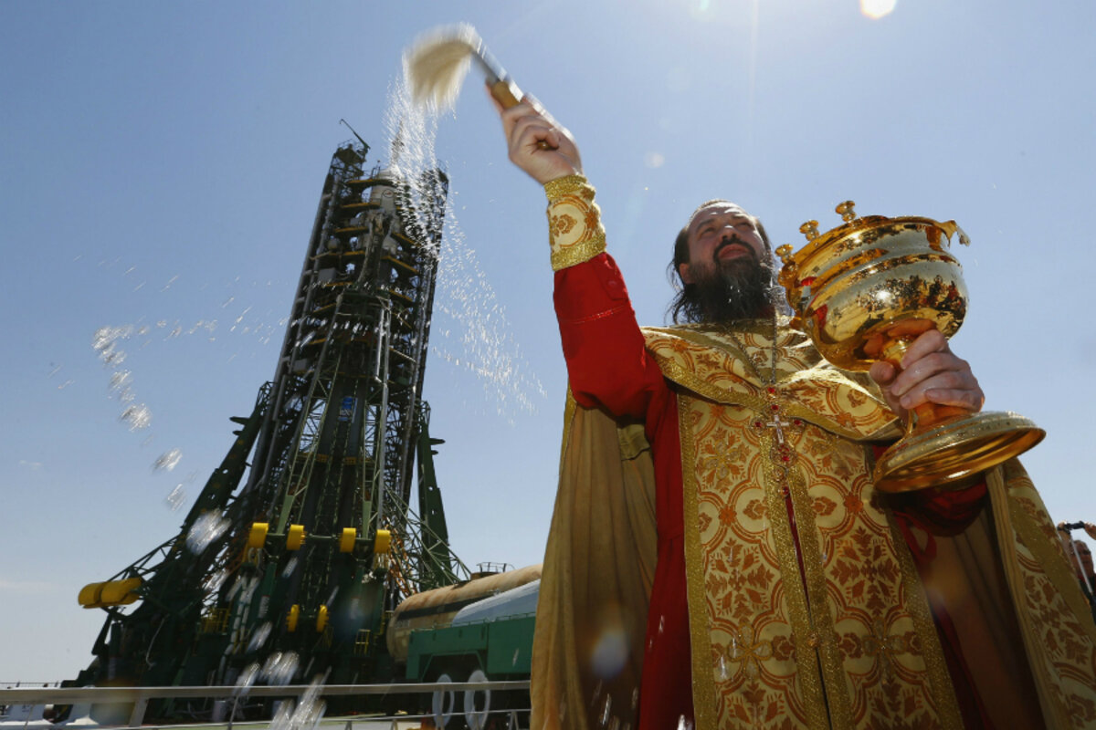 But just before the mid-December blastoff of the latest Soyuz mission to the International Space Station, the countdown procedure was halted to allow a robed and bearded Russian Orthodox priest a few minutes to shuffle around the mighty rocket, sprinkling holy water on its fuselage, murmuring snatches of biblical verse, and calling upon God to keep it safe. He also blessed each of the three astronauts 鈥 American, Russian, and British 鈥 about to make the journey.