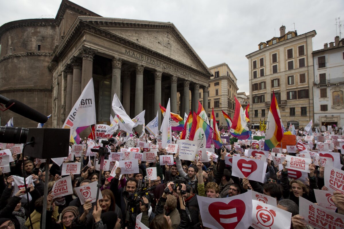"In Italy people think that there are those who are allowed to have rights and those who aren't," said Liliana Rizzo, a member of a gay parents' association, at a rally outside the Pantheon in central Rome.