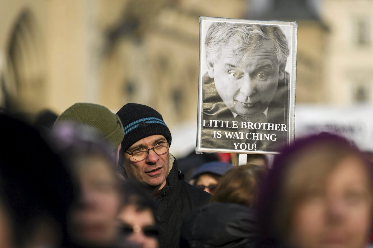 Waving Polish and European Union flags, the protesters demanded that the Law and Justice party withdraw its planned changes to the surveillance law.