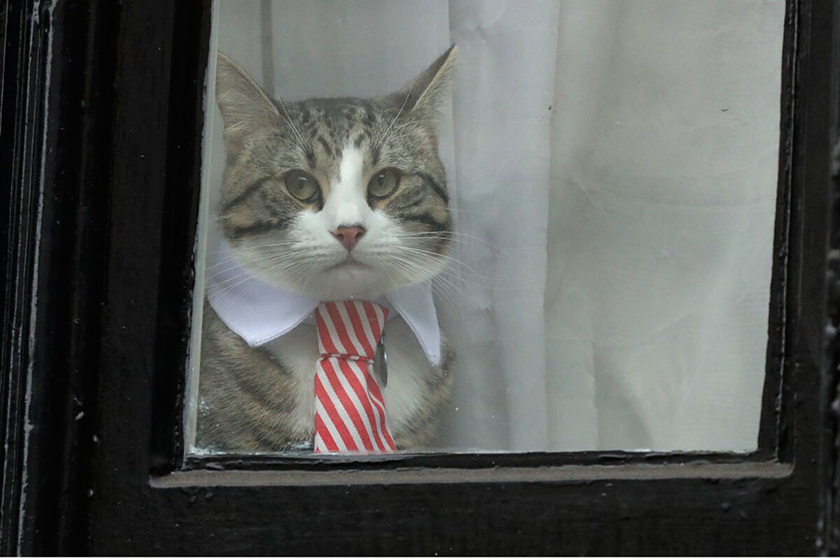 In the meantime, journalists and Assange supporters have been gathering outside Ecuador's London embassy, where the questioning could last several days. No glimpse of the man himself was to be had, but a cat thought to belong to Assange, one that has , settled down at the window to watch proceedings outside, dressed in a collar and tie.