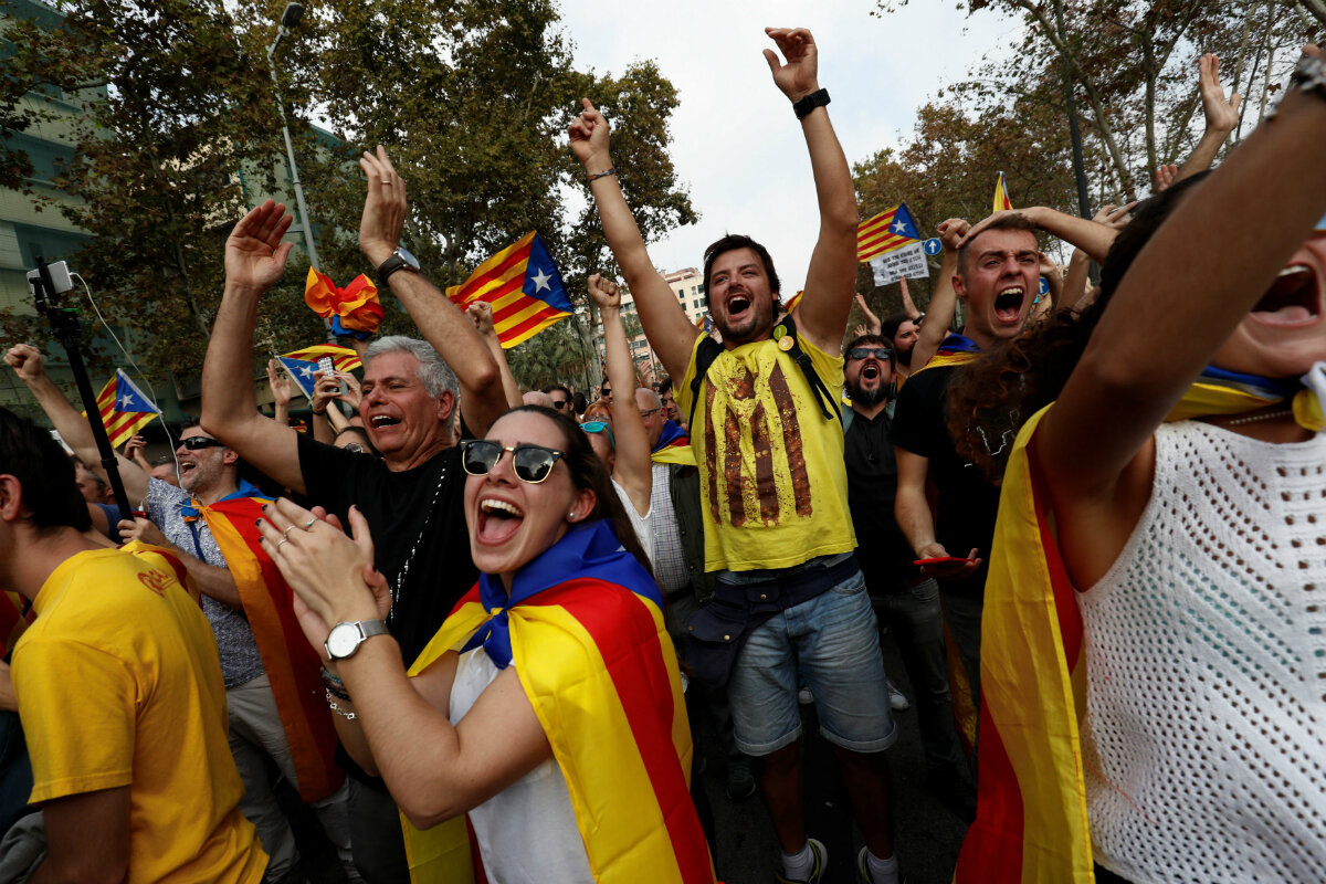 Outside parliament, thousands who had gathered cheered the news, some dancing and raising a toast. In Barcelona, people crowded around TV sets to watch the historic events unfold. The famous Sant Jaume Square outside the regional government office was packed with thousands of people celebrating. Many were draped with the "Estelada" flag that adds a blue triangle to the red and yellow Catalan flag and has become a symbol of the separatist struggle.