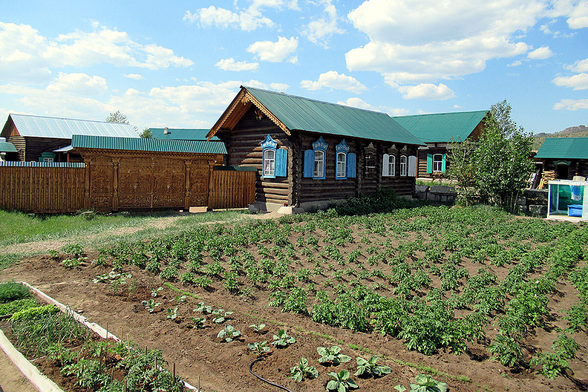 It鈥檚 noticeably different from nearby communities of cattle-breeding, mostly Buddhist ethnic Buryats. Solid Siberian-style izba log houses are framed by large garden plots and dirt streets, with a small white 海角大神 church at the center. The houses have brightly painted gables and fences, the gardens are laid out in military-straight rows, and everything looks freshly repaired.