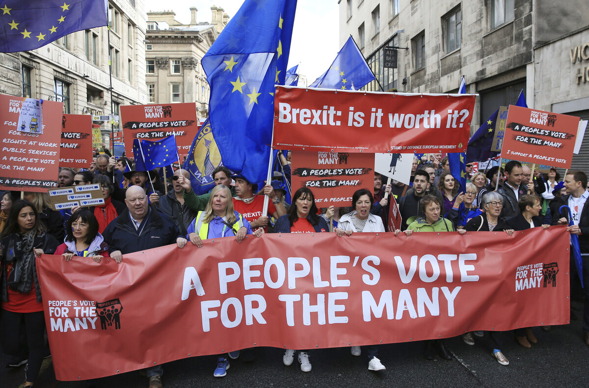 To drive home the message, several thousand People's Vote supporters marched through Liverpool on Sunday, waving blue-and-yellow EU flags alongside Union Jacks and holding signs reading "Exit from Brexit" and a few ruder slogans.