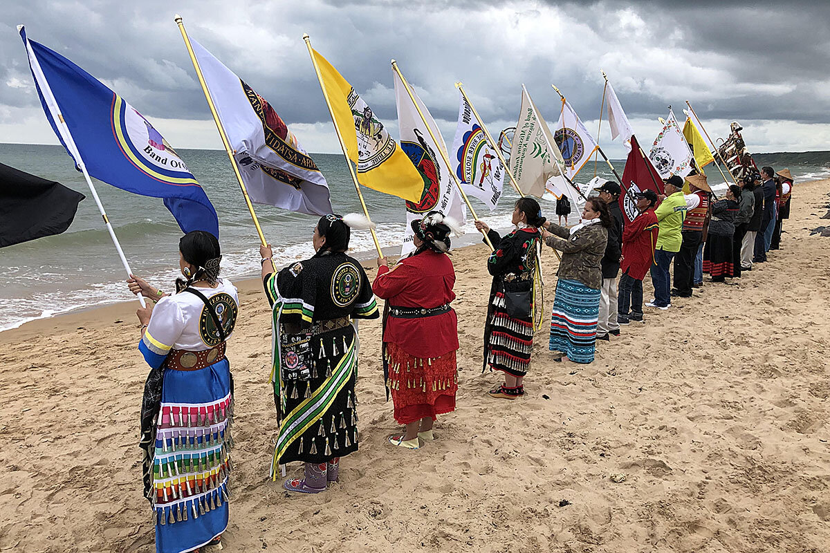The flag of the Penobscot Indian Nation flies above the low dunes at Omaha Beach in Saint-Laurent-sur-Mer. At the base of the flagpole stands a sculptured granite turtle. This monument is the focus of a tribute to the 175 Native American soldiers who struggled up this shore on D-Day 75 years ago. On Wednesday, a delegation representing numerous tribal nations gathered here for a commemorative ceremony led by Charles Norman Shay, the World War II combat veteran for whom the small memorial park is named.