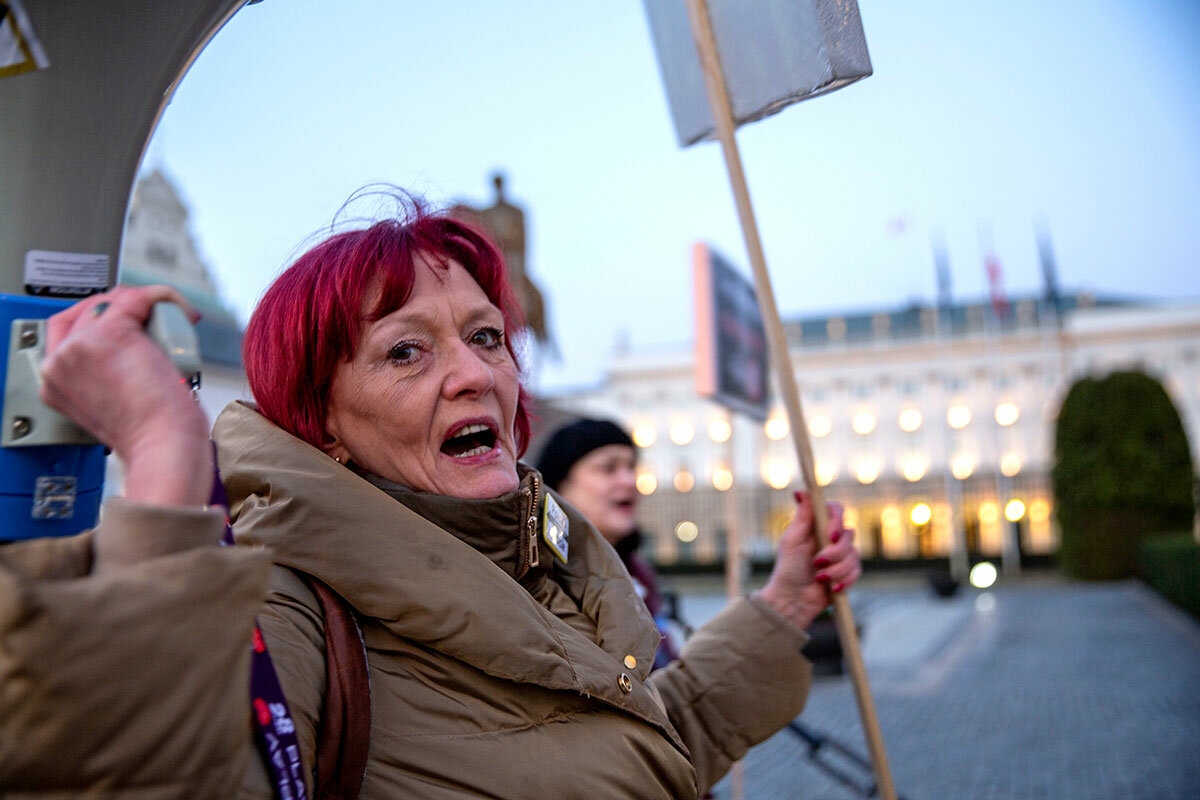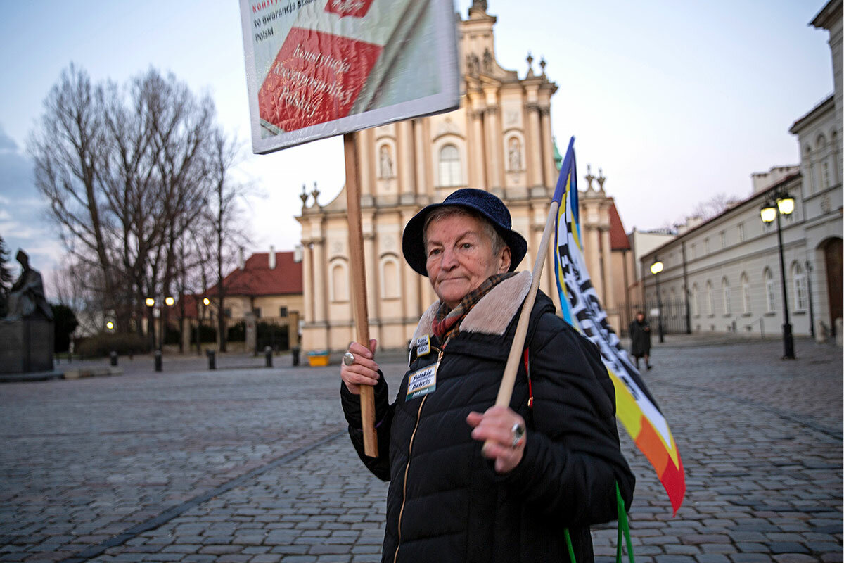 Like Ms. Piotrowska, Anna Irena 艁abu艣聽works the streets with zeal. One of the oldest members of the protesting grannies, she grew up in a small lumber town in central Poland but as an adult worked in a bank in the capital. When demonstrating, the widow wields a rainbow flag like a lance and glares at passersby who fail to pick up a leaflet.