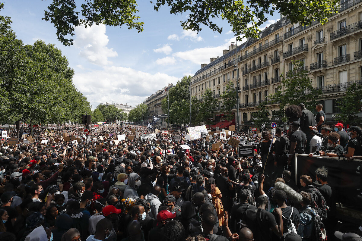 At least 15,000 people demonstrated in Paris on Saturday and more in other cities like Marseille and Lyon, the latest in a string of French protests galvanized by the May 25 death of Mr. Floyd 鈥 a Black man who died after a white Minneapolis police officer pressed a knee to his neck 鈥 and the Black Lives Matter movement, but increasingly focused on France's own tensions between police and minorities.