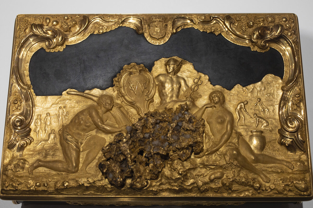 Nearby, a huge wooden set of stocks and heavy iron chains and locks used to constrain enslaved people stands close to a small box, intricately decorated with gold, tortoiseshell and velvet celebrating some of the valuable commodities traded by the Dutch West India聽Company in the 18th century: gold, ivory and human beings.