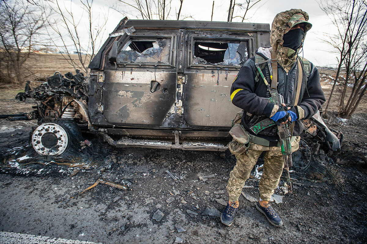 Standing beside the burnt remains of the vehicle, his face covered with a black wrap against the cold,聽Artur聽describes how he recognized the 鈥淶鈥 symbol on the vehicle, which is used by Russian forces to identify themselves.