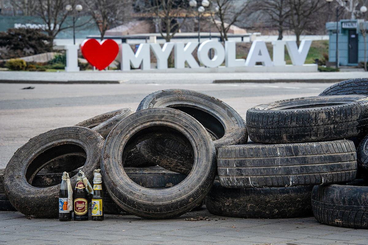 Every corner of each intersection in Mykolaiv is piled with used tires and a few Molotov cocktails, whose smoke, when they burn, will block the view of oncoming Russian soldiers in the case of urban combat.
